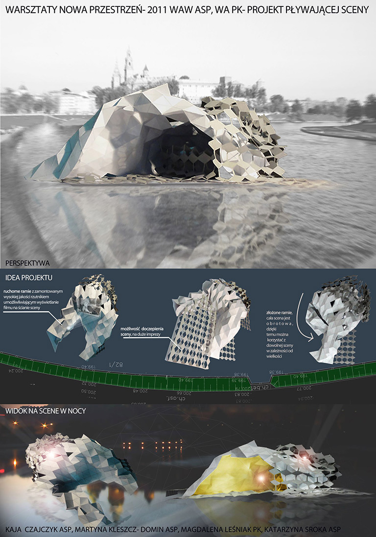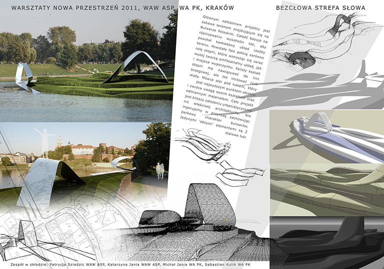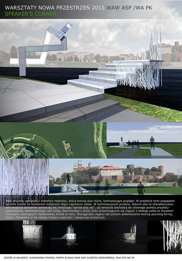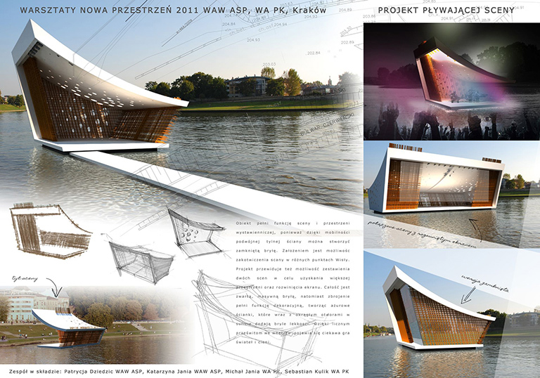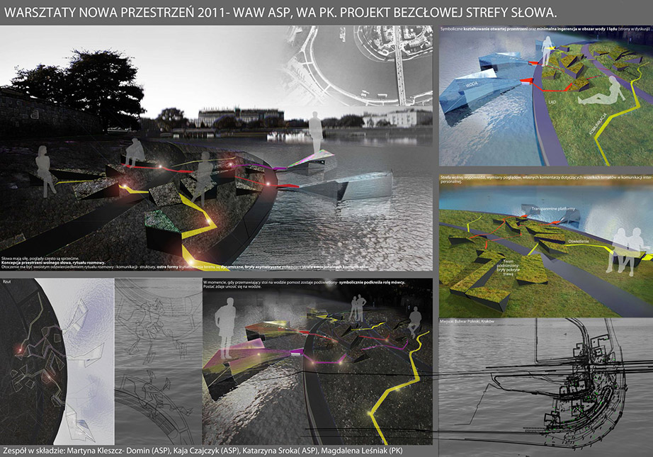 W trwających od 14 do 16 listopada warsztatach wzięło udział ponad trzydziestu studentów, którzy utworzyli osiem zespołów projektowych. Zadanie, jakie przed nimi postawiono, polegało na zaprojektowaniu „Pływającej Sceny” i „Wolnocłowej Strefy Słowa” (czyli Speaker’sCorner), w miejscu tak charakterystycznym dla Krakowa jak bulwary wiślane — bulwar Czerwieński i Poleski.